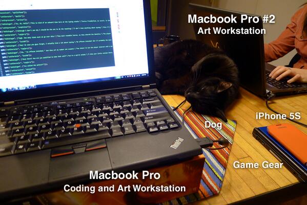 Dan does all of the coding, most of the “fast” artwork (small pieces that can be made pretty quickly), and all of the music and sound effects, and most of the writing. Jackie does all of the “slow” artwork (big pieces, like backgrounds, that take a long time), and assists in writing. She also is mostly in charge of our communication – Facebook, Twitter, all of that bullshit. We also have two cats who assist in lap warming and morale-boosting.